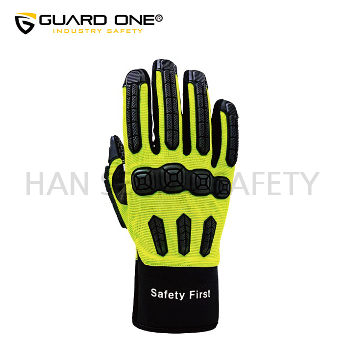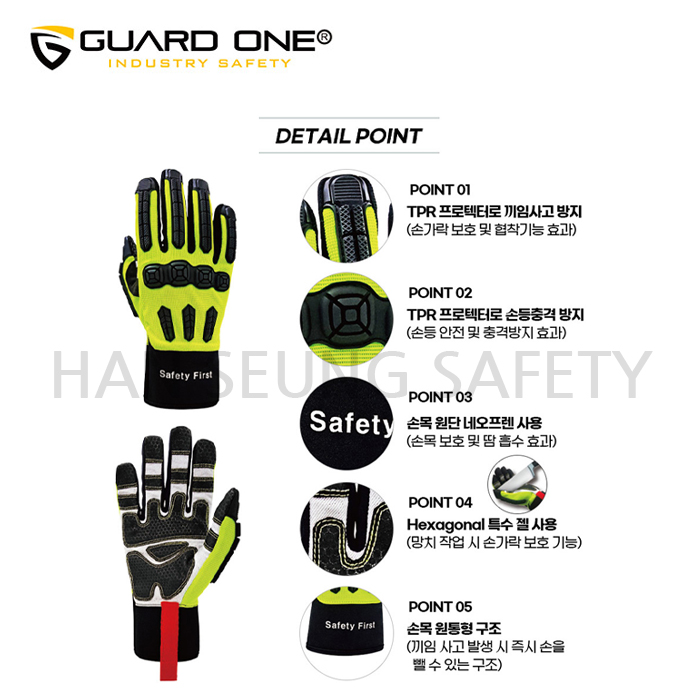 -모든 작업 시 무거운 외부 물체로 인해서 손이 다칠 위험을 방지하고자 손끝에 TPR이라는 특수 재질을 이용하여 끼임 사고나 충격을 1차적으로 흡수시켜주며, 끼임 사고발생 시 바로 손을 뺄수있는 구조로 만들어진 특수 안전장갑입니다.