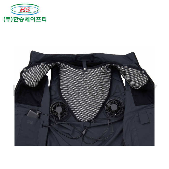 -쿨링 팬의 바람이 등쪽부터 몸통을 거쳐 목과 암홀로 배출되어 체열을 완화.