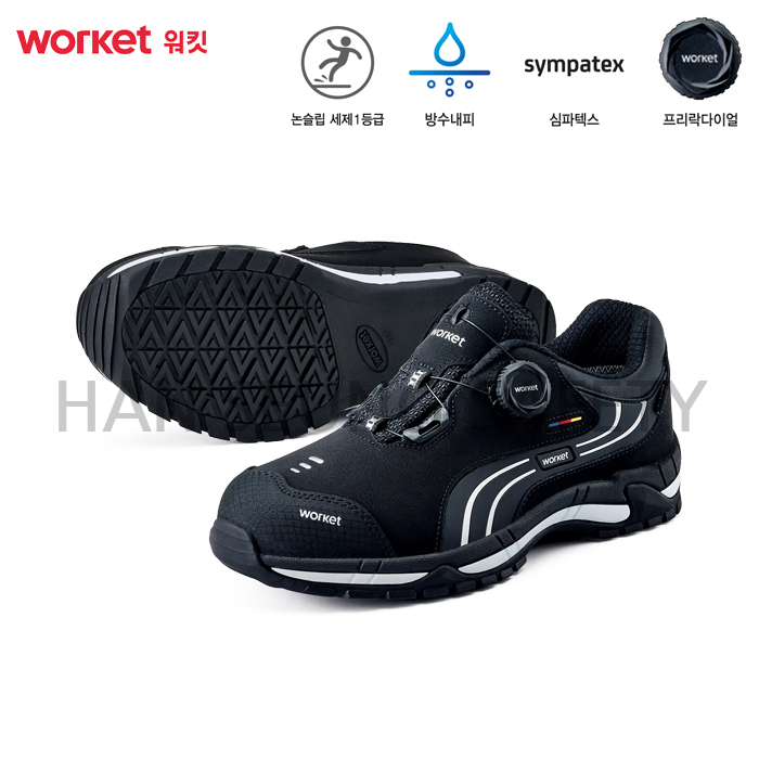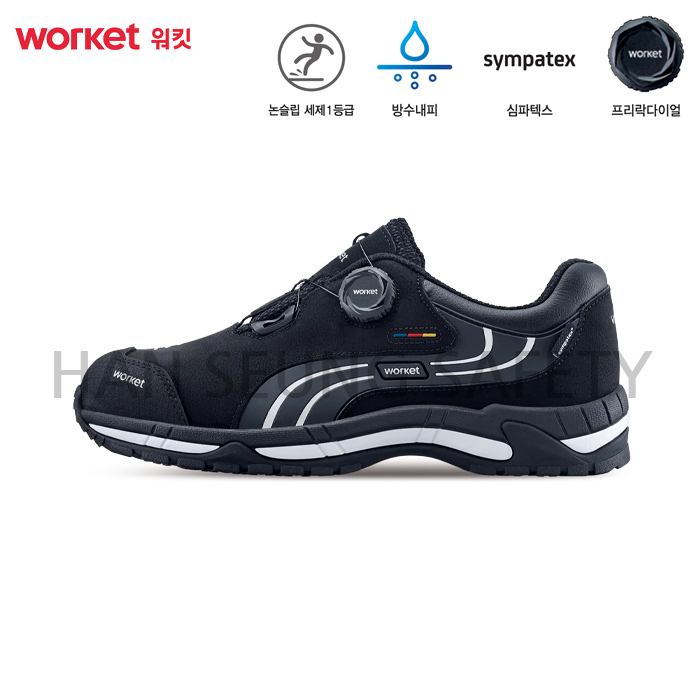 -블랙에 실버로 포인트를 준 TPR 구조를 통해 측면 지지력을 제공하며 안감에 사용된 심파텍스 방수 원단은 물, 세제, 기름 등 외부의 유해 화학 물질의 침입을 차단합니다.